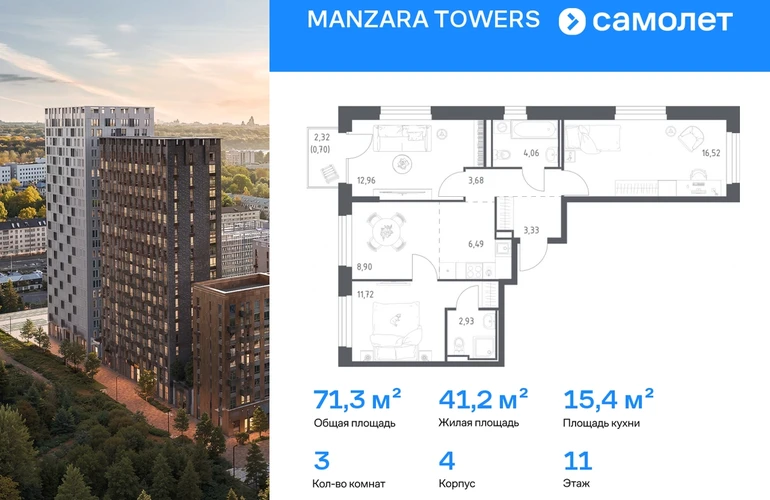 Строим кварталы для жизни с заботой о будущем. Предлагается 3-комнатная квартира комфорт-класса 71,29 кв.м в корпусе 4 на 11 этаже, в MANZARA TOWERS Квартира с предчистовой отделкой. Доступность дополнительных опций уточняйте у застройщика. Приобрести квартиру возможно по специальным акциям от застройщика, с текущими условиями акций можно ознакомиться в блоке «Акций». Цена динамическая и может отличаться, уточняйте актуальность у застройщика. Manzara Towers — это дома высотой от 7 до 24 этажей. В увеличенных окнах с зеркальной поверхностью отражаются облака и солнечные блики. Тихий двор с игровыми площадками и воркаут-пространством идеален для прогулок с кофе. На первом этаже есть выход на стилобат, где появятся зеленые оазисы и открытые террасы. Дома соединяет между собой частично прозрачный пешеходный мост. Предусмотрены подземный и 6-этажный многоуровневый паркинги. До ж/д вокзалов можно доехать за 20 минут. Или в обеденный перерыв встретиться с друзьями в центре города — дорога на машине займет около 15 минут. На первых этажах корпусов откроется детская поликлиника, ФОК с бассейном, магазины, кафе и салоны красоты. Для маленьких жителей уже работают 3 детских сада и лицей, до которых можно дойти за 6–15 минут. Во всех наших корпусах входы в светлые лобби находятся на уровне земли. На первом этаже есть специальные места для хранения колясок и велосипедов. #yan19-2r1819777#О застройщике