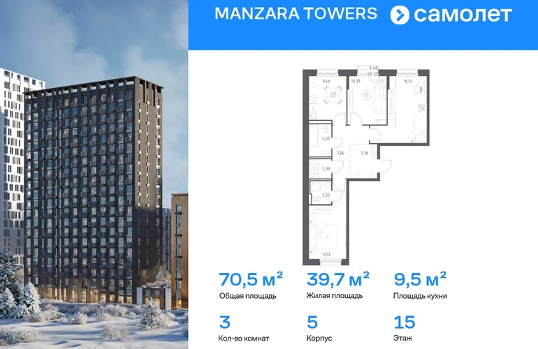 Строим кварталы для жизни с заботой о будущем. Предлагается 3-комнатная квартира комфорт-класса 70,47 кв.м в корпусе 5 на 15 этаже, в MANZARA TOWERS Квартира с черновой отделкой. Доступность опции «отделка» и возможность комплектации мебелью и декором уточняйте у застройщика. Приобрести квартиру возможно по специальным акциям от застройщика, с текущими условиями акций можно ознакомиться в блоке «Акций». Цена динамическая и может отличаться, уточняйте актуальность у застройщика. Manzara Towers — это дома высотой от 7 до 24 этажей. В увеличенных окнах с зеркальной поверхностью отражаются облака и солнечные блики. Тихий двор с игровыми площадками и воркаут-пространством идеален для прогулок с кофе. На первом этаже есть выход на стилобат, где появятся зеленые оазисы и открытые террасы. Дома соединяет между собой частично прозрачный пешеходный мост. Предусмотрены подземный и 6-этажный многоуровневый паркинги. До ж/д вокзалов можно доехать за 20 минут. Или в обеденный перерыв встретиться с друзьями в центре города — дорога на машине займет около 15 минут. На первых этажах корпусов откроется детская поликлиника, ФОК с бассейном, магазины, кафе и салоны красоты. Для маленьких жителей уже работают 3 детских сада и лицей, до которых можно дойти за 6–15 минут. Во всех наших корпусах входы в светлые лобби находятся на уровне земли. На первом этаже есть специальные места для хранения колясок и велосипедов. #yan19-2r1825826#О застройщике