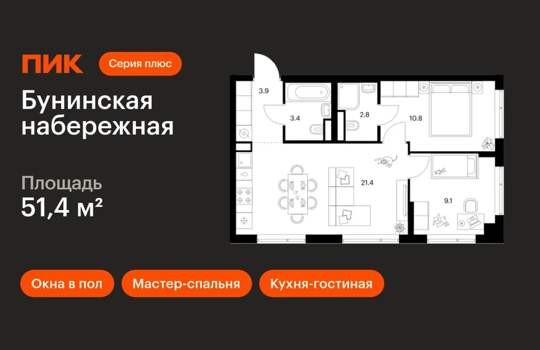 В Новой Москве продаётся 2-комнатная квартира квартира площадью 51.4 на 5 этаже 16 этажного дома (корпус 2.6/1.4, секция 4) в проекте ПИК «Бунинская набережная». Удобное расположение 18 минут пешком до станции метро «Потапово» и 12 минут на машине до метро «Бунинская аллея». 9 минут на машине до Солнцево-Бутово-Варшавского шоссе и 17 минут до МКАД. 8 минут на автомобиле до гипермаркета «Глобус». 15 минут на автомобиле до живописного Бутовского лесопарка и заказника «Южное Бутово». Особенности проекта «Бунинская набережная» — камерный квартал «Серии плюс» на берегу Ивановского пруда. В шаговой доступности вся нужная инфраструктура: детские сады, школы, поликлиники, игровая площадка ПлейХаб «Пирамиды» и скейт-парк. Удобные и разнообразные планировки позволят каждому выбрать квартиру для собственного сценария жизни. Преимущества проекта: Отделка: Готовая Особенности планировки: Мастер-спальня, Кухня-гостиная, Два и более санузла, Окна в пол, Внутрипольные конвекторы, Умная планировка Просторные и светлые лобби с быстрыми тихими лифтами. Дворы-парки с местами для отдыха, детскими и спортивными площадками. Пешеходный бульвар и благоустроенная набережная. Магазины, кафе и полезные сервисы на первых этажах домов. Подземный паркинг. АртикулО застройщике