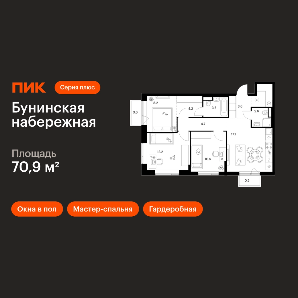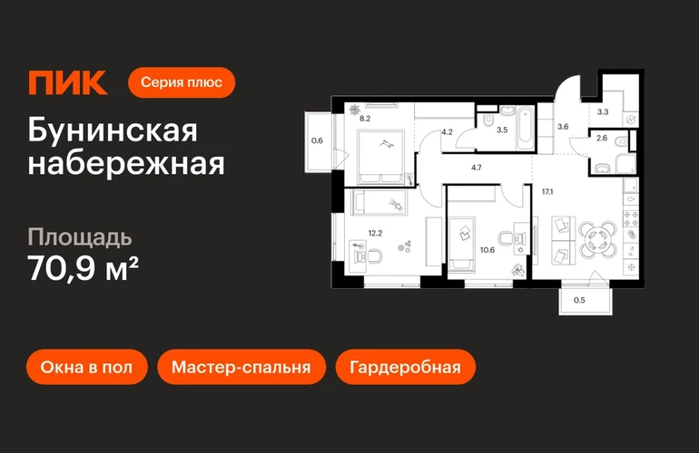 В Новой Москве продаётся 3-комнатная квартира квартира площадью 70.9 на 12 этаже 16 этажного дома (корпус 2.6/1.2, секция 2) в проекте ПИК «Бунинская набережная». Удобное расположение 18 минут пешком до станции метро «Потапово» и 12 минут на машине до метро «Бунинская аллея». 9 минут на машине до Солнцево-Бутово-Варшавского шоссе и 17 минут до МКАД. 8 минут на автомобиле до гипермаркета «Глобус». 15 минут на автомобиле до живописного Бутовского лесопарка и заказника «Южное Бутово». Особенности проекта «Бунинская набережная» — камерный квартал «Серии плюс» на берегу Ивановского пруда. В шаговой доступности вся нужная инфраструктура: детские сады, школы, поликлиники, игровая площадка ПлейХаб «Пирамиды» и скейт-парк. Удобные и разнообразные планировки позволят каждому выбрать квартиру для собственного сценария жизни. Преимущества проекта: Отделка: Предчистовая Особенности планировки: Гардеробная, Мастер-спальня, Кухня-гостиная, Два и более санузла, Открытый балкон, Окна в пол, Внутрипольные конвекторы, Умная планировка Просторные и светлые лобби с быстрыми тихими лифтами. Дворы-парки с местами для отдыха, детскими и спортивными площадками. Пешеходный бульвар и благоустроенная набережная. Магазины, кафе и полезные сервисы на первых этажах домов. Подземный паркинг. АртикулО застройщике