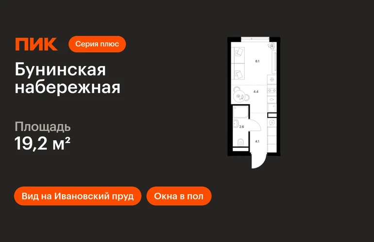 В Новой Москве продаётся студия квартира площадью 19.2 на 8 этаже 16 этажного дома (корпус 2.6/1.4, секция 4) в проекте ПИК «Бунинская набережная». Удобное расположение 18 минут пешком до станции метро «Потапово» и 12 минут на машине до метро «Бунинская аллея». 9 минут на машине до Солнцево-Бутово-Варшавского шоссе и 17 минут до МКАД. 8 минут на автомобиле до гипермаркета «Глобус». 15 минут на автомобиле до живописного Бутовского лесопарка и заказника «Южное Бутово». Особенности проекта «Бунинская набережная» — камерный квартал «Серии плюс» на берегу Ивановского пруда. В шаговой доступности вся нужная инфраструктура: детские сады, школы, поликлиники, игровая площадка ПлейХаб «Пирамиды» и скейт-парк. Удобные и разнообразные планировки позволят каждому выбрать квартиру для собственного сценария жизни. Преимущества проекта: Отделка: Готовая Особенности планировки: Окна в пол, Вид на Ивановский пруд, Внутрипольные конвекторы Просторные и светлые лобби с быстрыми тихими лифтами. Дворы-парки с местами для отдыха, детскими и спортивными площадками. Пешеходный бульвар и благоустроенная набережная. Магазины, кафе и полезные сервисы на первых этажах домов. Подземный паркинг. АртикулО застройщике