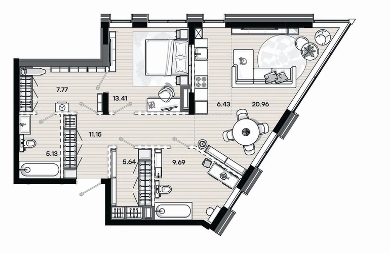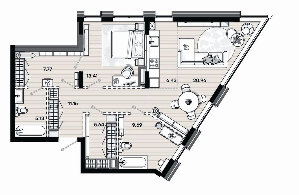 Визитная карточка проекта — эргономичные планировки. Здесь все устроено максимально удобно, продуманы места хранения, пространства для семейного отдыха и уединения.