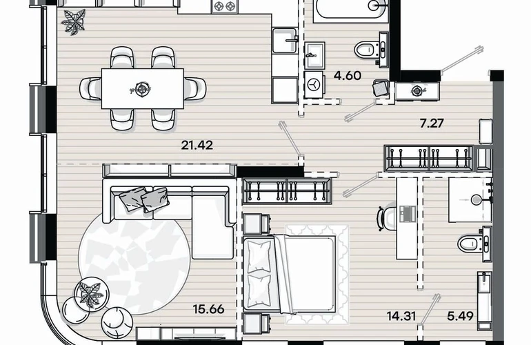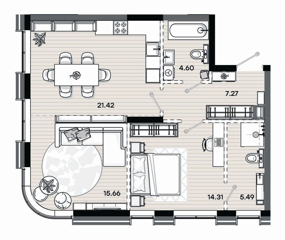 Визитная карточка проекта — эргономичные планировки. Здесь все устроено максимально удобно, продуманы места хранения, пространства для семейного отдыха и уединения.